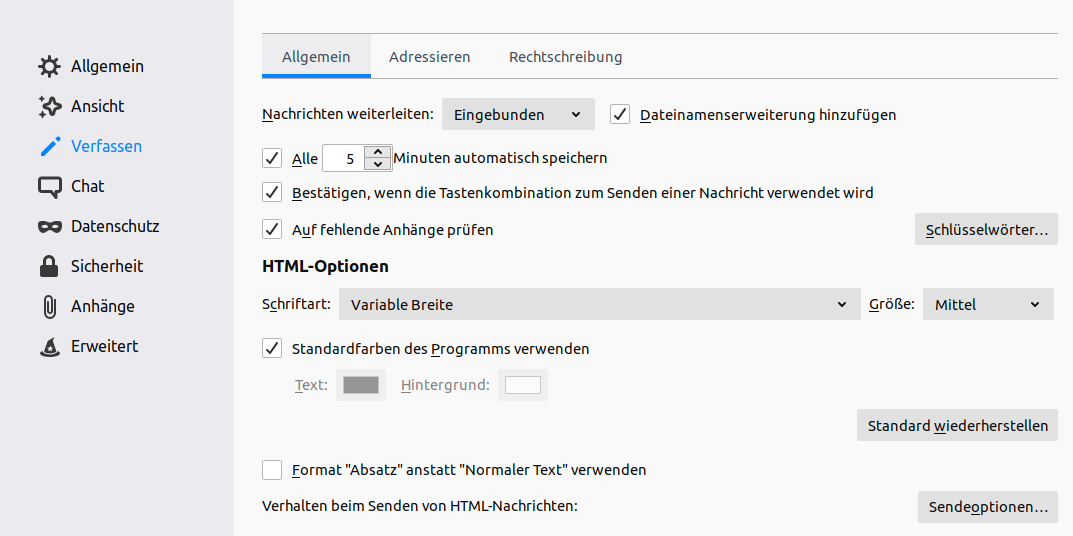 - Verfassen => Allgemein => ‘Format “Absatz” anstatt “Normaler Text” verwenden’ deaktivieren